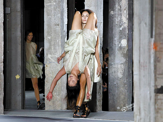 今年,话题设计师瑞克·欧文斯 (Rick Owens) 再次为巴黎时装周贡献了不少谈资。他的秀场上,女模特“倒挂金钩”在另一个模特身上走秀,画面怪异,网友纷纷高呼:“抱歉是我不懂时尚”“是不是模特太多没地方使了?”