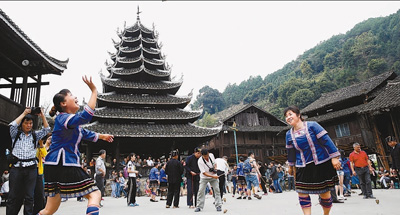 日前,湖南省通道侗族自治县双江镇芋头村侗寨,村民在为游客表演侗家歌舞。国庆长假期间,该县坪坦、皇都、恭城书院、万佛山等景区景点吸引了众多慕名而来的国内外游客。