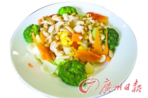 通常将蔬菜和马蹄洗净切成细粒,稍微飞一下水,以增加蔬菜的脆爽度。选取优质小木耳先以冷水泡开、去掉杂质,再改用热水泡熟,捞起沥干水分待用。热锅酌量加入橄榄油,小炸腰果,倒进姜片、蒜片爆香,然后加放前述所有食材,用中火均匀爆炒。其实,烹饪此菜的“功夫”都在手上,唯有拿捏得当方才口感爽脆甘香,一旦热炒太久则香脆尽失。