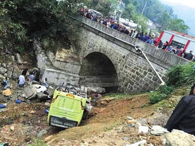 昨日7时50分许,安徽省六安市霍山县落儿岭镇境内,一辆大巴车在途经省道下坡时,侧翻坠入干涸河道,目前已致7人身亡、31人受伤。新京报记者了解到,该大巴车核载37人,实载38人,但因乘客中有幼童和婴儿,该车并未超载。事故原因正在调查中。图/CFP