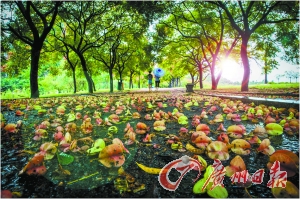 广州日报肇庆讯 (记者于敢勇 通讯员许庆彬摄影报道)风雨过后有彩虹,“彩虹”过后有落花。肇庆星湖绿道七星岩北门段在“彩虹”过后,惊现“落花大道”,行人走在这里,就像置身于“爱丽丝梦游仙境”之类的童话故事中。
