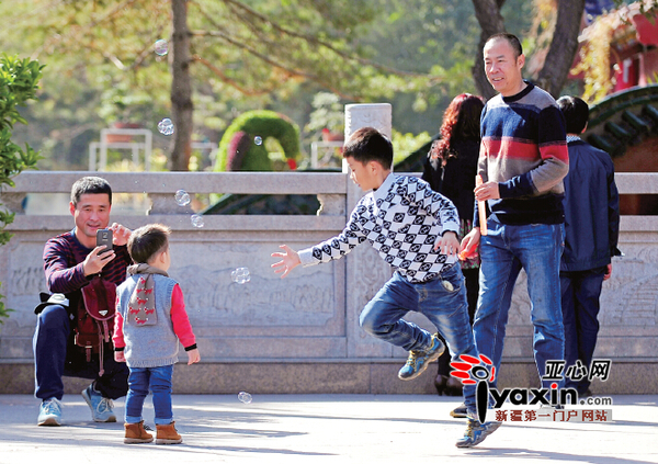 国庆长假收官之际,乌市红山公园的游客依然非常多。昨日,红山公园,阳光明媚、天高气爽,几名游客带着孩子来玩,小宝宝被肥皂泡吸引,引得大人赶忙拍照;大宝宝禁不住蹦起来想要抓住肥皂泡。亚心网记者谢鹏摄