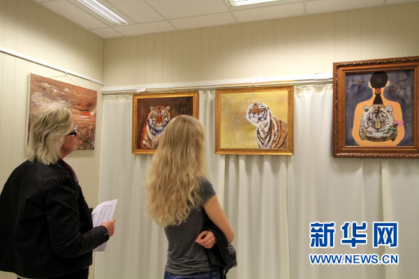 10月3日,在挪威中部的北弗朗市,人们在画展上参观。旅挪华人书画家王萍个人画展于10月3日至10日在北弗朗市图书馆举行。与此同时,王萍还举行多期书法课,向当地学生传授中国书法艺术。新华社记者梁有昶摄