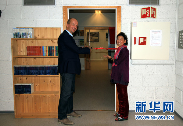 10月3日,在挪威中部的北弗朗市,市长奥拉夫·罗瑟姆(左)与王萍为画展剪彩。新华社记者梁有昶摄
