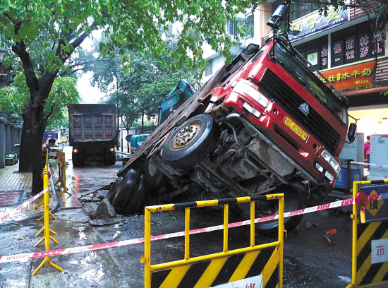 究竟何种原因导致地陷?现场一名工作人员分析,“应该是自来水管之前就有渗漏,将路基泡软,加上工程车超载,一下子就压塌了。”目击者徐先生对这一分析表示认同,“我都见到水溅起来,肯定是自来水管之前就漏了,幸亏是大车,要是小车就掉进去了”。
