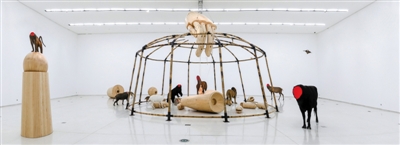 黄永砅此次新个展(下图)一如既往有着大场面,其善用的动物形象充斥了美术馆的大部分展厅。或者从某种程度上说,其对动物形象的偏爱也是此展举办的契机之一。该展策展人是侯瀚如,他与黄永砅就“蛇杖”项目的合作始于意大利国立二十一世纪美术馆MAXXI。侯瀚如说,黄永砅的作品经常出现动物的形象,蛇是其中一个非常关键的主题。蛇可以引申出很多意义,同样在宗教里蛇也有重要的象征意味。当两人谈到意大利国立二十一世纪美术馆MAXXI做展览时便想到以“蛇杖”为题,“罗马是西方宗教的中心,黄永砅就提出蛇杖展览计划,使用的是《圣经》里面摩西带着埃及犹太人出走的故事,当他们走到荒漠里,快要失去信心的时候,某种奇迹的形式给摩西带来了希望,把他的手杖变成一条蛇,通过这样来表达信心。”