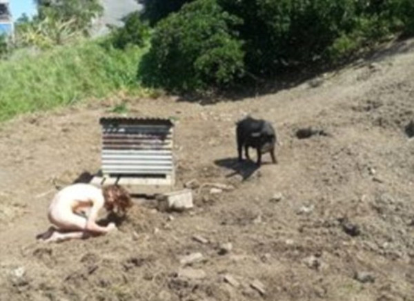 这名“冷冻鸡”爱好者在农场一头猪的旁边摆姿势(网页截图)
