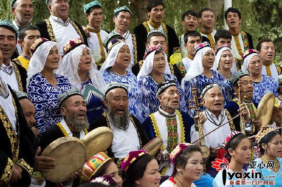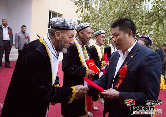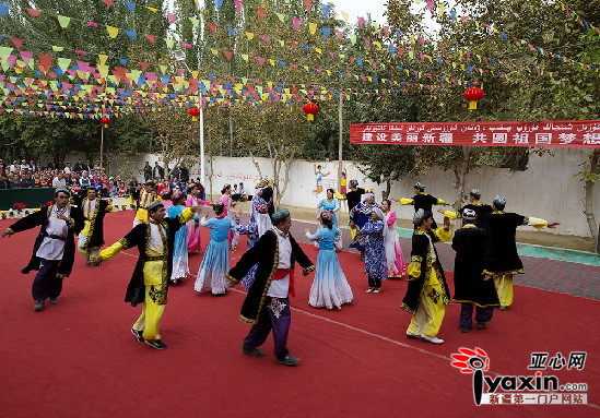 亚心网讯(通讯员 金炜摄影报道)9月30日,叶城县江格勒斯乡黑尼恰喀(8)村委会里人声鼎沸,热闹非凡。来自江格勒斯乡600多位农民艺人聚集在村委会大院里,以庆祝国庆节和自治区成立60周年为契机,欢跳阿勒喀舞庆祝叶城县江格勒斯乡阿勒喀舞传承中心挂牌成立。