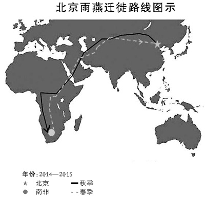 以对其中一个定位器的分析结果为例,佩戴它的雨燕去年7月23日离开北京颐和园,开始南迁,飞越天山山脉和红海,10月27日到达南非纳米比亚越冬。今年2月2日,这只雨燕启程返回故乡北京,并于4月15日回到颐和园。一年间,仅迁徙途中的飞行距离就超过了2.6万公里。