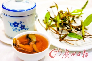 石仙桃又名石上莲、石橄榄、石萸肉等,生长在福建、广东、广西、云南等地,秋季正是其收获季节,性甘凉,以鲜用最好,也可以开水烫过后晒干用,具有养阴、清肺、利湿、消瘀的功效。由珠江新城山泉公馆推出的这款石仙桃炖鹧鸪汤,取整只鹧鸪、半斤瘦肉、6两鸡脚,再加入新鲜的石仙桃、元肉干和矿泉水,一起放入陶瓷鼎中,隔水清炖4小时。炖好的汤汁呈金黄色,连着茎叶的石仙桃飘浮在汤汁中,像一条条绿色的翡翠,汤色非常诱人,入口有淡淡的馨香和回甘味。