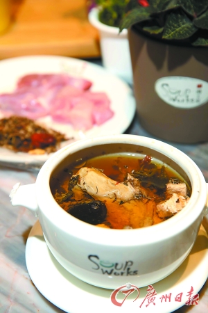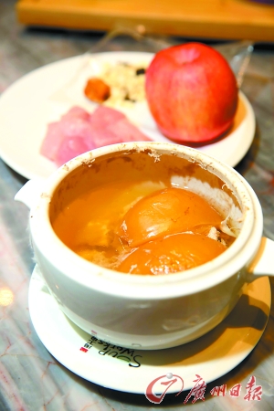 揭开汤盖,一股柔和淡雅的异香蹿出,初闻带有浓郁的苹果香气,细品却又夹杂着杏仁的异香,隐约还有几分如丁香花一般的香气。珠江新城天下泽雨汤工房行政总厨告诉记者,该汤是根据一位老中医提供的秘方配制,加入蒸馏水炖160分钟而成,不仅深受小朋友喜欢,且对长期抽烟人士和缓解支气管疾病有奇效。其中苹果可调节肠胃、降低胆固醇,且含有利于儿童生长发育的细纤维和能增强儿童记忆力的锌。川贝可清热化痰,润肺止咳,尤宜于内伤久咳、燥痰、热痰之症。