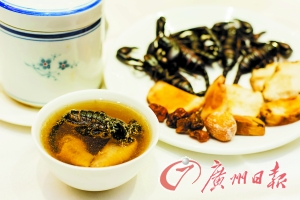 草龟肉味甘、咸、性平,具有养阴补血、益肾填精、止血之功效;蝎子具有祛风、解毒、止痛、通络的功效。将乌龟与蝎子炖在一起,颇有些以毒攻毒的味道,再加入新鲜土茯苓和晒干的土茯苓各2~3片、元肉干、红枣等一起炖,汤色呈金黄色,汤盅里面飘浮着一只黑色的蝎子。新鲜土茯苓虽然利水、消肿、固精、安神、健脾胃功效比不上干土茯苓,但口感更加清甜,不过喝起来有明显的回甘,很清甜,入喉非常舒爽清甜。