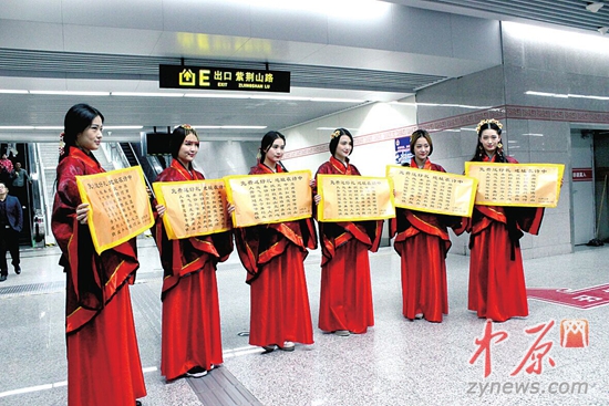 中原网讯(记者 李丽君 文/图)据传郑州地铁最近奇事多。果不其然,10月9日就发生了这样一出奇事。一群身穿汉代华服、头扎古代发髻的汉服美女惊现郑州地铁,更为奇特的是,这些汉服美女手中还持着一首诗。