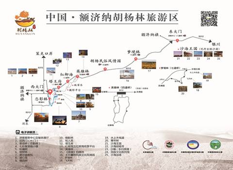 额济纳胡杨林世界沙漠地质公园景区内根据河流上的桥为标志,分别划分为一道桥、二道桥、三道桥……一直到八道桥,景区内铺设的木栈道连接引导游客游览,目前五、六道桥景区还未正式对游客开放。景区内有交通车摆渡,平均15分钟一趟,凭票免费,可以接送游客往返于28公里的沿线景区主要停泊站点。