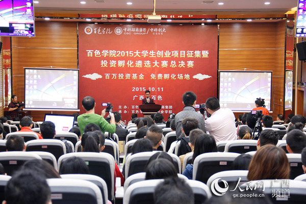人民网百色10月11日电(沈泉池) 10月11日,百色学院2015大学生创业项目征集暨投资孵化遴选大赛总决赛在百色学院澄碧校区开赛。本次大赛,百色学院经广泛发动,在对参赛项目进行预审和初评的基础上,经过层层选拔,共有11组选手晋级总决赛。决赛以PPT文稿演示为主,参赛选手结合制作精美的PPT,针对企业概述、项目展望、风险因素、投资回报、组织管理、财务预测等内容进行了全面介绍,阐述了自己的创新思维与创业理念。