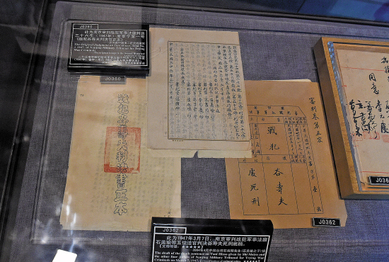 侵华日军南京大屠杀遇难同胞纪念馆陈列的《战犯谷寿夫判决书正本》复制件和南京审判战犯军事法庭石美瑜等五位法官判决谷寿夫死刑的底稿 新华社发