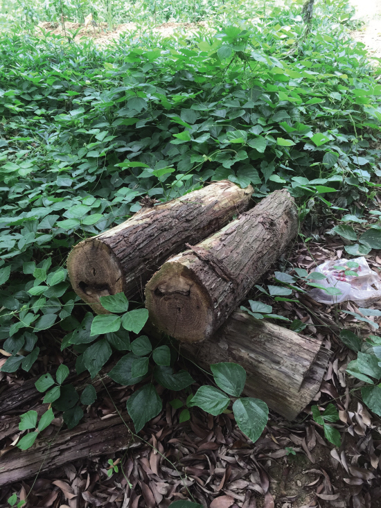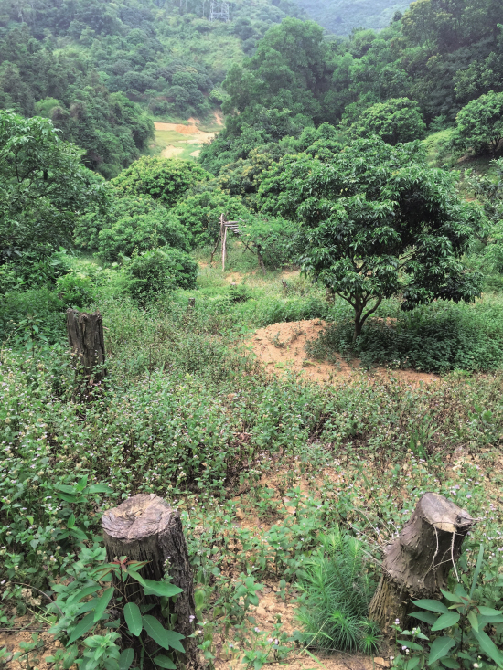 果树林里还有砍伐者居住的痕迹,修了灌溉的水池、搭了篱笆,建了水泥的桌椅,还遗留了许多生活垃圾。笔者发现,果林里堆着一些砍伐的原始植被,许多树已经长到直径达20厘米,均被锯断堆在一起。一些遭到砍伐的树桩孤零零地立泥土里,与郁郁葱葱的荔枝树形成鲜明的对比。