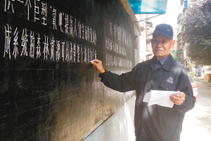 在与杨升堂老人交谈当中,记者得知,老人从铜川某单位退休,2005年从铜川搬到凤城一路西铁小区居住,从此闲余时间就奔波于西安各大社区,寻找有黑板报的社区,并义务承担办黑板报的工作。杨升堂说,他以前在铁路铜川车站当接车员,此外还负责车站内黑板报的宣传工作,从那时起,他便渐渐喜欢上了办黑板报。“如今黑板报逐渐被人们放弃,只有老旧小区还保存着这种宣传方式,很多新建小区都改用宣传画了,但我觉得黑板报很环保,不应该被扔掉。”说完,杨升堂又拿起粉笔继续写写画画。