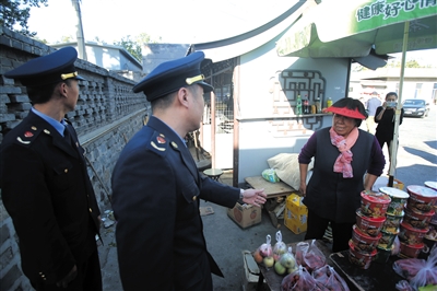 昨日,明十三陵景区,执法人员让摊贩出示营业执照。