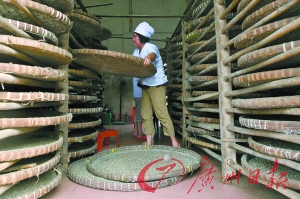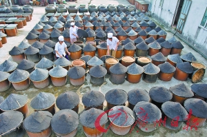 近日,记者来到还在生产着这样的豆酱的寮步美味副食有限公司。偌大的露天晒场里,500多个传统大瓦缸整齐排列着,里面盛满豆酱、黄豆酱、面豉、豆豉等,有的“头戴”黑斗笠,有的顶着玻璃盖子,有的则裸露在空气中“干晒”。老师傅陈柱和告诉记者,顶着玻璃盖子的是面豉,“干晒”的是寮步豆酱、豆豉,当晒到一定程度时,豆酱、豆豉就需要“戴上”斗笠。