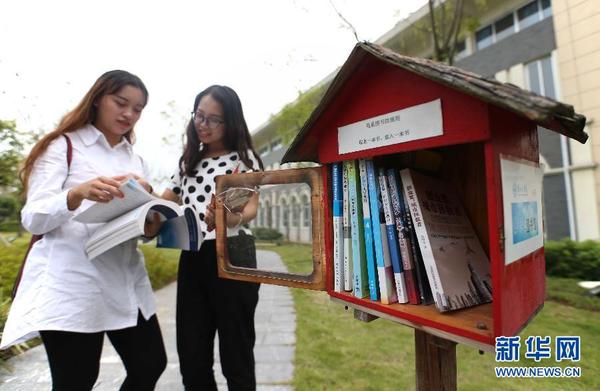 广西一大学校园的“鸟巢图书馆” 借一本书要放入一本
