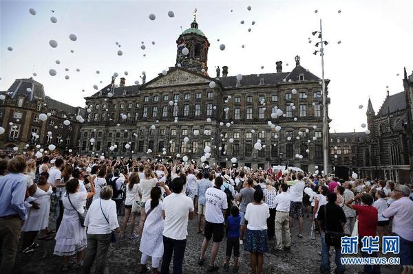 2014年7月23日,在荷兰首都阿姆斯特丹,人们参加悼念马航MH17航班失事客机遇难者的活动时放飞气球。当天,两架运载约40具马航MH17航班失事客机遇难者遗体的飞机抵达荷兰。新华社/法新