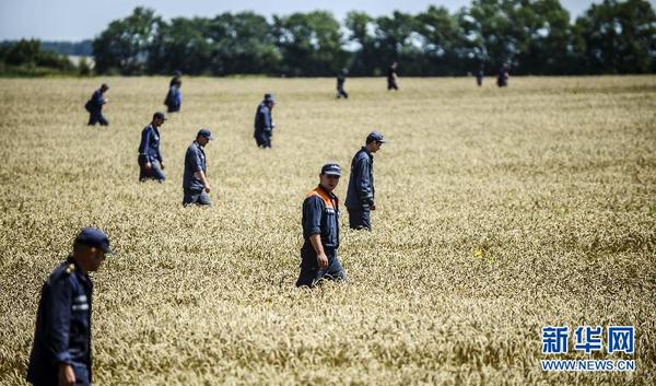 2014年7月26日,在乌克兰顿涅茨克地区,乌克兰紧急情况部门工作人员在马航MH17航班客机失事区域搜寻遇难者遗体。 新华社/法新