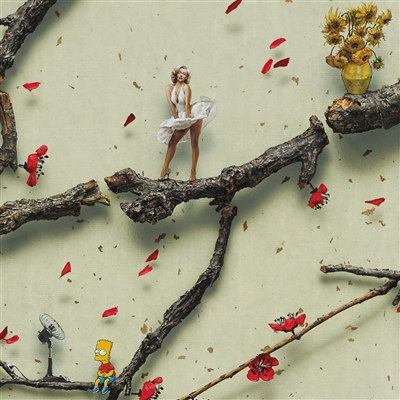 当东方文化传统遭遇西方当代艺术后,韩国艺术家也做出了自己相应回应,一如中国艺术家们。此次展览主角金准植的回应方式还是颇有视觉奇观效应的。画面中那些熟悉的花卉是东方文化传统中乐于表现的,不过却突然闯入了超人、梦露、关羽、米老鼠等形象。类似他的作品《红梅——羞花闭月,沉鱼落雁》(下图,局部)、《金梅——关羽叔叔》等中,传统的“折枝”之下分明是从社会流行文化的现实出发,波普风分外明显。无论是对时尚品牌logo的使用还是以偶像作为故事的逻辑模型,艺术家通过波普的方式重新“导演”了“偶像之间的故事”。