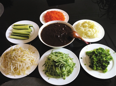 至于我自己,小时候“妈妈的味道”是煎蛋饺。其实在我家里,不仅是妈妈的味道,还有奶奶的味道、舅舅的味道。因为我们家是满族人,小时候在北京生活,吃炸酱面(图2),不是现在说赶不急吃一顿炸酱面,凑合凑合。炸酱面是不能凑合的,炒酱要一个半小时到两个小时,面码至少有十个,怎么能凑合。这个酱从一开始放下去没什么味道,到炒一个小时以后,小四合院满院飘香,然后每一种菜码得特别整齐,黄瓜一边切丝,一种切段儿,特别讲究。