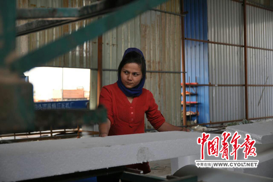 夏尔瓦娜·买买提明在自家的钢构厂里给丈夫帮忙。杨阳摄