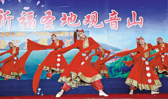 据广州歌舞剧院演出经理刘飞彤介绍,在本次节目的选择上,他们特地挑选了多支具有中国各地特色的民族舞蹈。“观音山的游客来自五湖四海,为此,我们特地把全国各地的歌舞元素融合在节目中,希望观众能够找到亲切感。”除了《喜鹊喳喳喳》的山东秧歌元素之外,演员们还表演了蒙古族女子群舞《天鹅之歌》、傣族舞蹈《红是红啊绿是绿》、藏族女子群舞《心声》……精彩的表演赢得观众阵阵掌声。