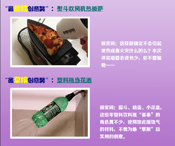 行文至此,全球年度爆笑省钱创意奖也全部揭晓啦,这正是:吹风机熨斗热披萨,七喜饮料瓶做花洒,爆笑省银子哪家强,且看本小编来发奖!![]()