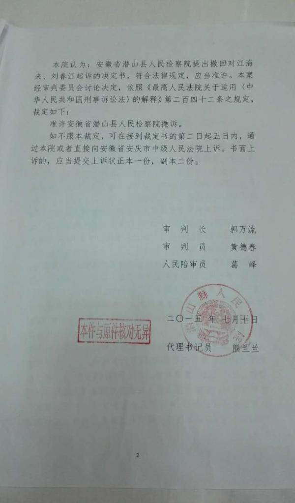 让江海来意外的是,未及法院判决,2015年7月,潜山县检察院决定撤回对他和刘某某的起诉。