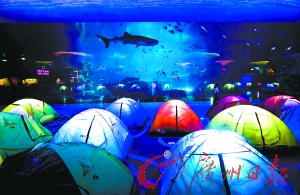 鲸鲨馆的水族箱前则是大家夜晚下榻的地方,亲手在巨大的水族箱前搭起帐篷,看鲸鲨从头顶游过,看一只只海龟在脚边慢行,慢慢地也进入了梦乡……不仅如此,第二天早晨在游客们到来之前,夜宿鲸鲨馆的游客们还可以观看动物饵料的制作过程,触摸像果冻一样的水母,看白鲸享用早餐。