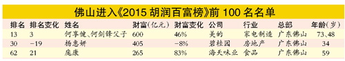 记者梳理2015胡润百富榜前100名名单了解到,佛山地区有3个家族或个人上榜。分别是:排在第13位美的集团的何享健家族、排名第30位的碧桂园集团的杨惠妍家族和排名62位的海天集团的庞康。