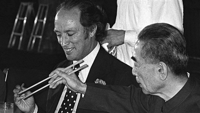 1973年,周总理教老特鲁多使用筷子 供图/新华国际