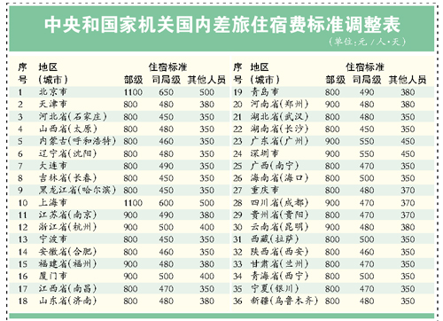 其中,调整北京、上海等11个城市部级干部住宿费标准、7个城市司局级干部住宿费标准和33个城市处级及以下干部住宿费标准。