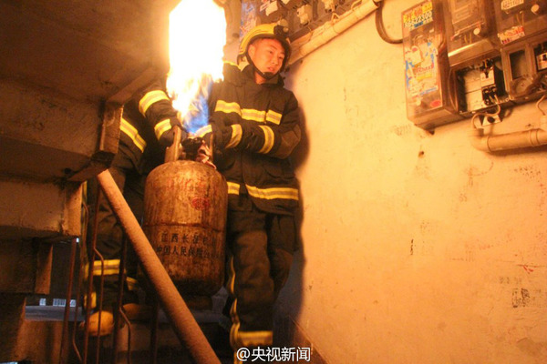 国际在线消息,据【央视新闻】微博消息,19日,江西南昌袁女士家的液化气罐突然起火。消防赶到时,气罐正喷着一米余长火舌。危急时刻,消防官兵胡庆松、胡景春抱起气罐往楼下冲。火苗掠过脸颊,他们强忍着把气罐抱至空旷处灭火,避免一场事故。