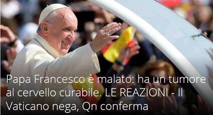 记者 杜晓菲】据英国路透社10月21日报道,意大利一家媒体当天在头版刊登了“教皇患有”脑瘤的消息。” 意大利《国家日报》21日在头版的位置报道称,现年78岁的教皇曾乘坐直升机秘密前往托斯卡纳的一座小城拜访一名日本医生,他被诊断出“脑部有一个小黑点”,但是这种病是可以治愈的。