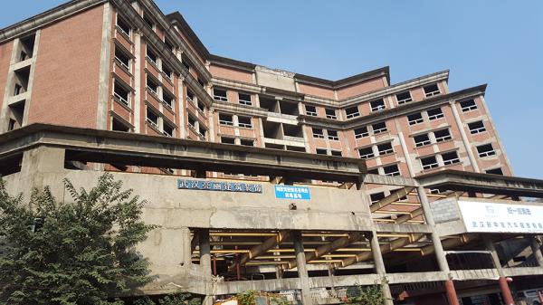 在武汉市江夏区北华街和古驿道交界处,一栋光秃秃的8层大楼矗立在街角。大楼主体结构已建成,外立面完成装修。大楼里未开始装修,已经安装的空调管道,有的掉落,有的不翼而飞。大楼背后,还有一个未完工的室内游泳池。
