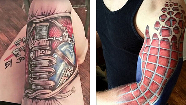 左图中斯蒂尔在一名模特的大腿上绘制“速度与激情”中场景,右图在是其在另一名男子手臂上描绘“蜘蛛侠”套装。(网页截图)