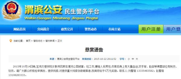 10月22日晚间,陕西宝鸡当地公安渭滨公安民生警务平台发布悬赏通告,将悬赏5万元缉凶手。