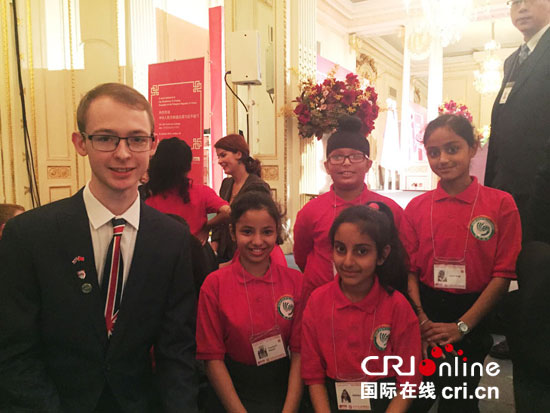 英国大学生康可与伦敦大学教育学院孔子课堂小学生在开幕式现场。(摄影:丁宁)