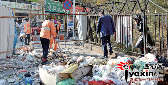 10月21日,乌市红庙子路西六巷,环卫工人正在清理阳光雅润苑六期侧门的垃圾。亚心网记者史纪伸实习生朱小辉摄