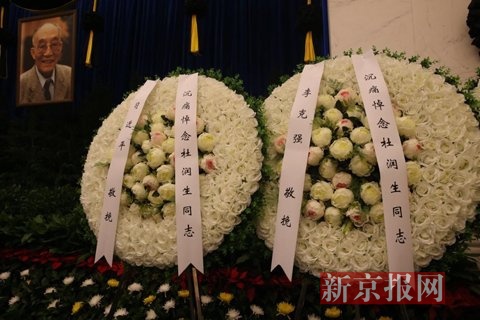 新京报记者在现场看到,大礼堂中摆放着习近平、李克强、张德江、俞正声、刘云山、王岐山、张高丽等党和国家领导人敬送的花圈,江泽民、胡锦涛等老同志敬送的花圈也依次摆在现场。中央和国家机关有关部门负责同志,杜老生前好友和家乡代表也前来送别。