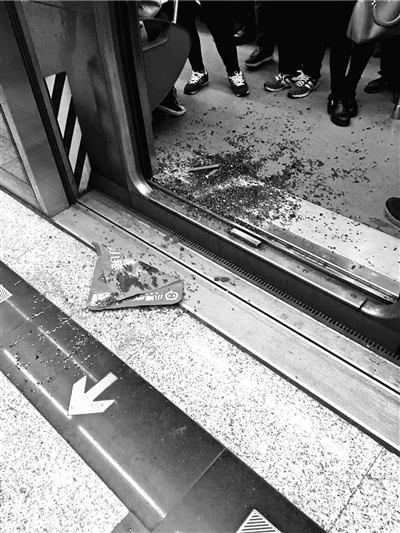 地铁到站后,网友拍摄的被砸车门的玻璃渣 供图/网络