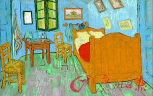还有,在凡·爱克的作品中,日光是从左边窗口照入的,室内的东西都呈现着微妙的明暗差别,这种光线使每一件东西都带有坚固的实在感。而梵高的寝室内,正面的窗只开了一点点,室内却连一点阴影也没有。最后,我们永远无法搞清那倾斜着的墙和门到底朝着什么方向。你不妨试一下,把床头上面的右侧墙与正面墙的分界线遮去,你立刻会感到右墙再也不像墙壁了。