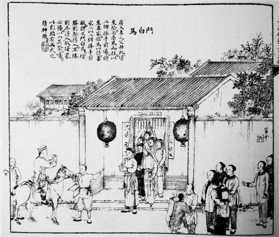 斗白马本是南越族的习俗,来源甚古,最早见于宋代周去非《岭外代答》一书中。1907年12月出版的《时事画报》(下图)对此习俗作了记述,图中的说明文字录自周去非的《岭外代答》一书。