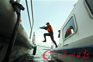 边防官兵驾驶快艇逐步贴近货船两侧进行包抄迫停。左侧的官兵顺利登上货船。但此时,在货船右侧的快艇却遇到了大麻烦。由于船艇的航速快,加上侧面袭来的风浪异常剧烈,导致船体不断颠簸,而且货船在行进中不时右拐,多次与边防快艇发生摩擦碰撞。