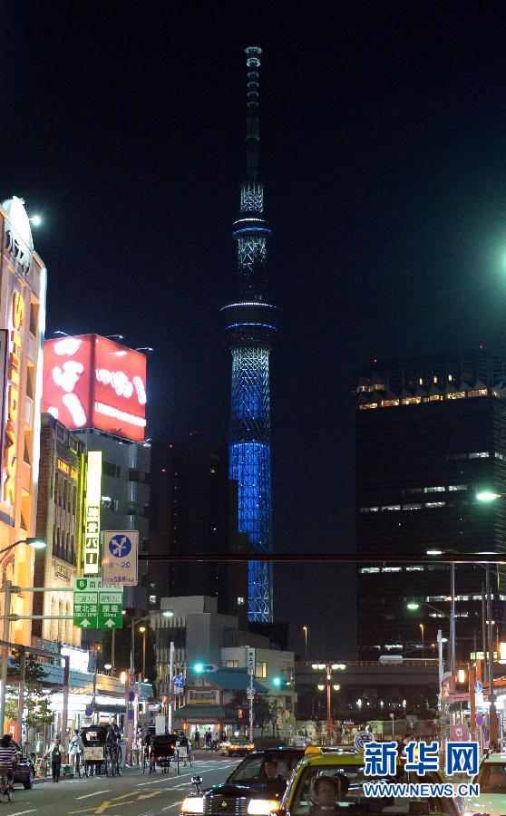 10月24日,日本东京晴空塔亮起蓝灯,纪念联合国成立70周年。 10月24日是联合国日,同时也是《联合国宪章》生效和联合国正式成立70周年纪念日,全球地标性建筑被联合国的官方颜色——蓝色点亮,以庆祝联合国成立70周年。新华社记者马平摄